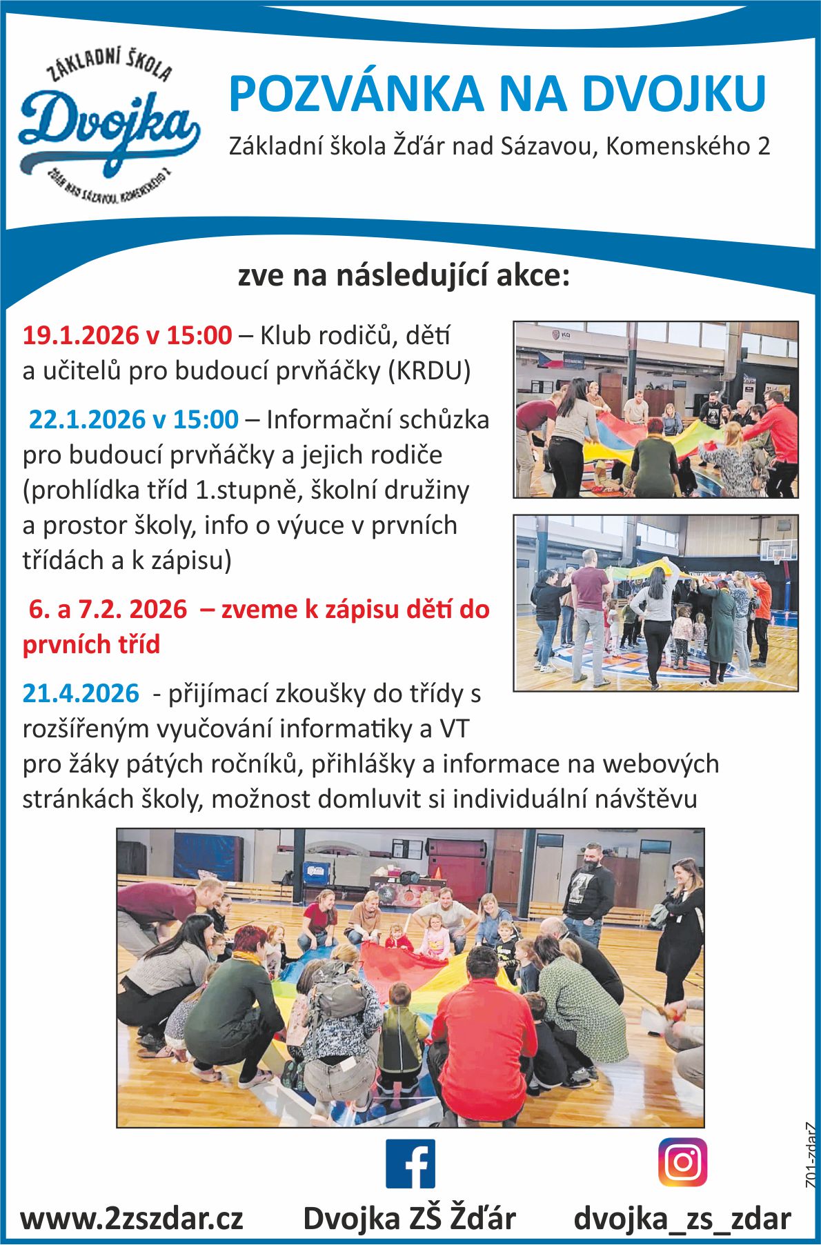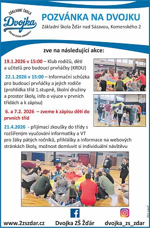 Termín zápisu:Zápis do 1. ročníku základní školy pro školní rok 2026/2027 proběhne v Základní škole Žďár nad Sázavou, Komenského 2 v termínech: